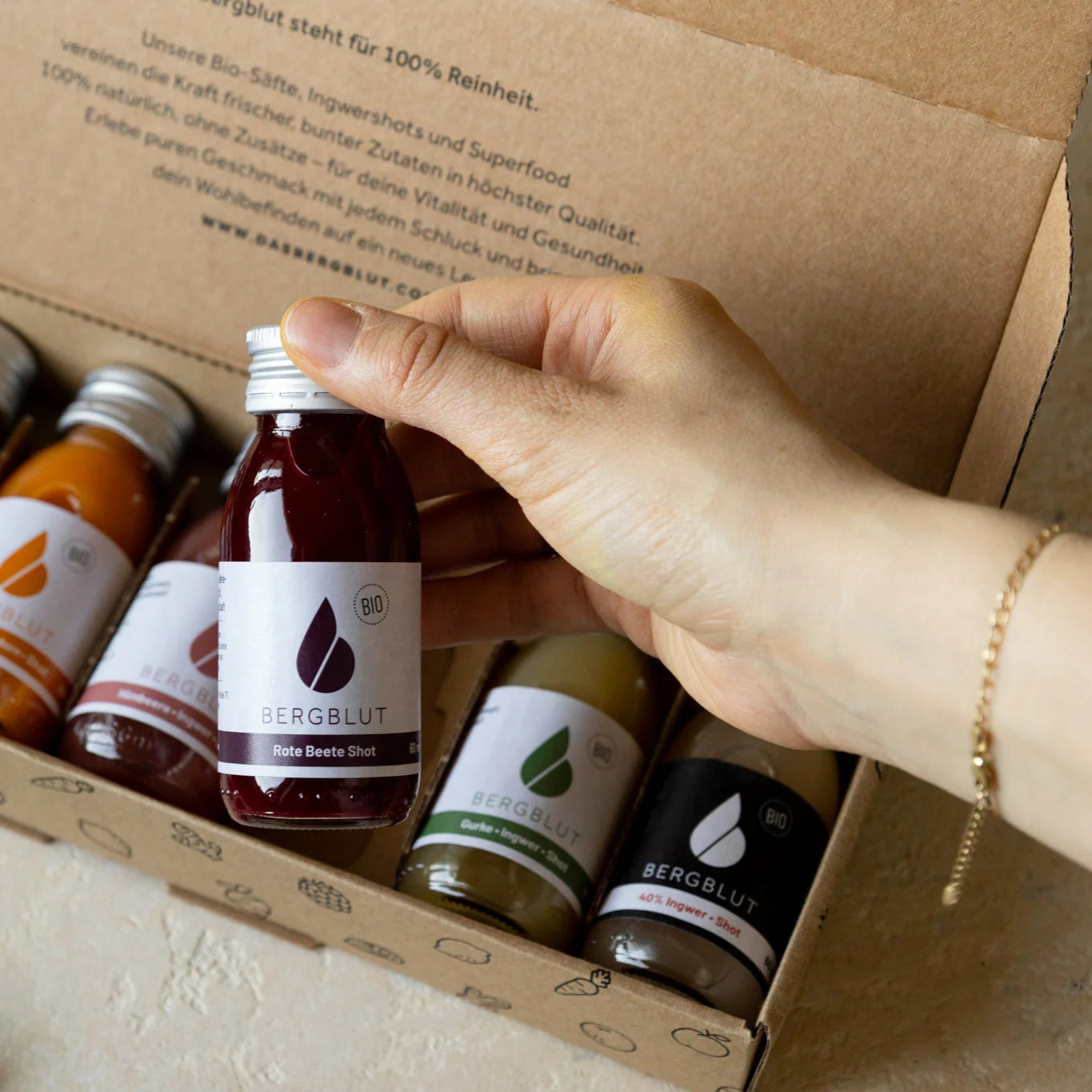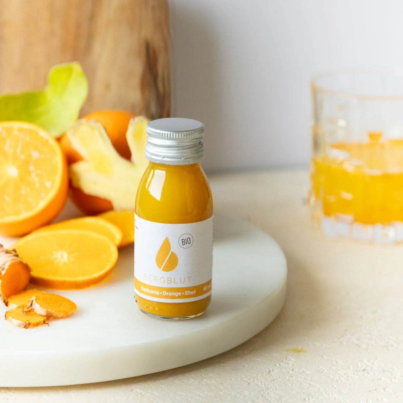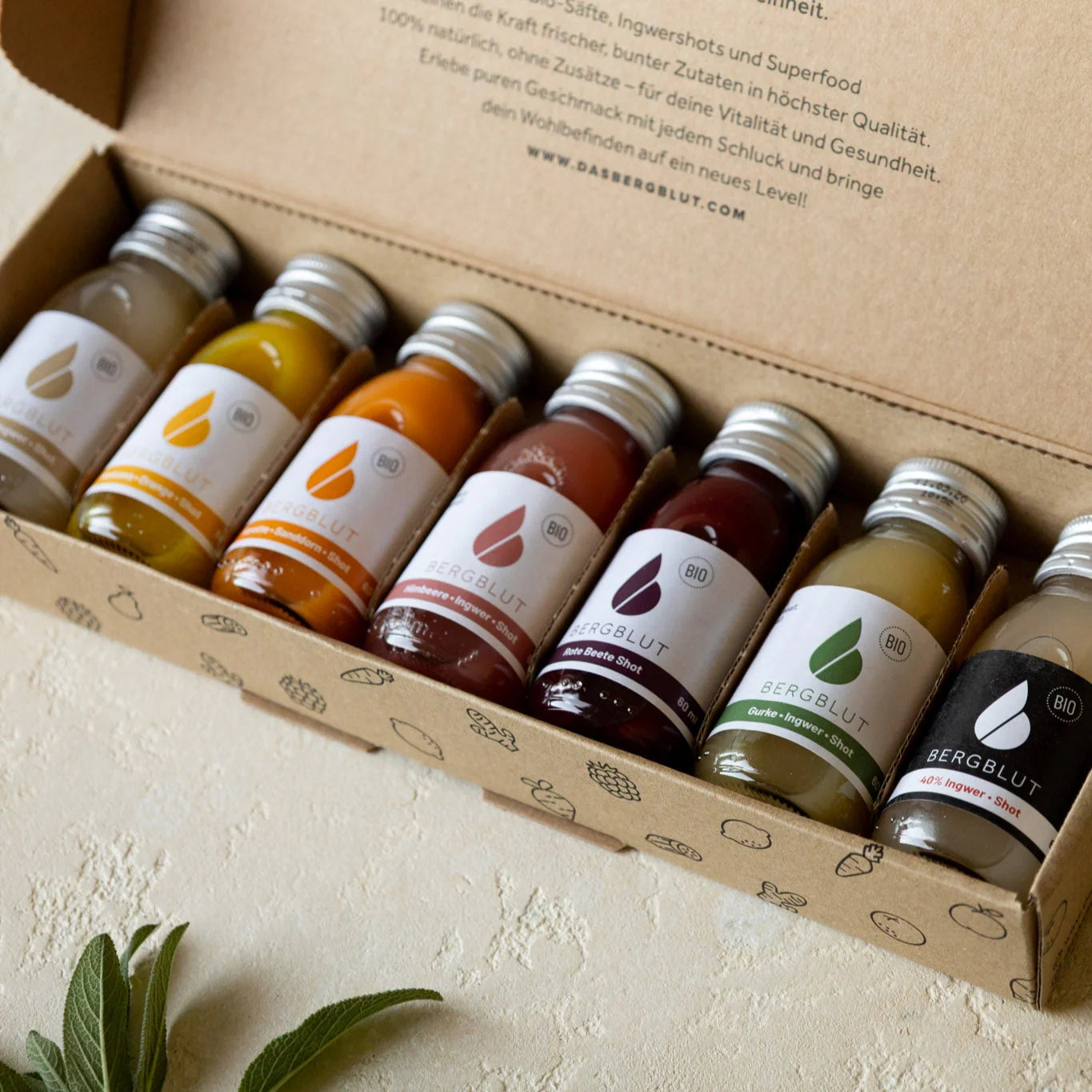 Jeder Bergblut Bio-Shot ist pure Natur in konzentrierter Form – kaltgepresst aus sorgfältig ausgewähltem Bio-Obst und -Gemüse, ohne Zusätze, ohne Kompromisse. Frisch aus den Alpen, mit Zutaten, die voller Vitamine, Enzyme und Antioxidantien stecken. Kurkuma, Ingwer, Sanddorn & Co. arbeiten synergetisch, um deinen Stoffwechsel zu aktivieren, Entzündungen zu hemmen und dein Immunsystem zu stärken. Kein Trend, sondern echtes Handwerk – und wahrscheinlich das Beste, was du täglich für dich tun kannst.