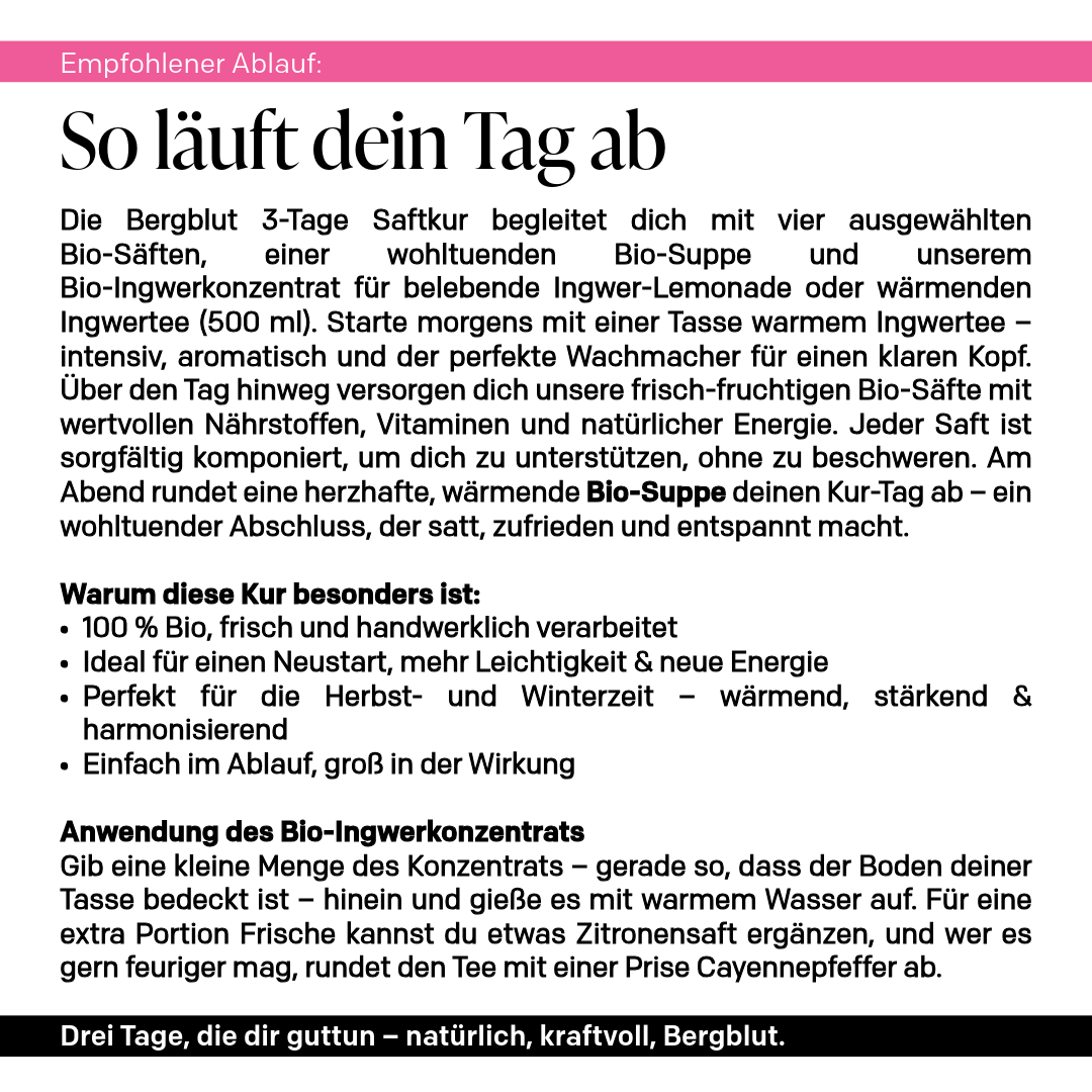 Warenwert 111,90 € – jetzt in der Black Week für nur 83,90 € (–25 %) Die PRESSBAR Black Week Bio Saftkur ist dein 3-Tage-Reset für Körper und Kopf. Vier kaltgepresste Bio-Säfte, eine wohltuende Bio-Suppe und unser Bio-Ingwerkonzentrat begleiten dich durch einen klar strukturierten Ablauf, der leicht in den Alltag passt. 100 % Bio, handwerklich produziert und voll natürlicher Nährstoffe – ideal, um Belastungen loszulassen, neue Energie zu tanken und entspannt in Herbst und Winter zu starten. Drei Tage, die wirken. Drei Tage PRESSBAR.